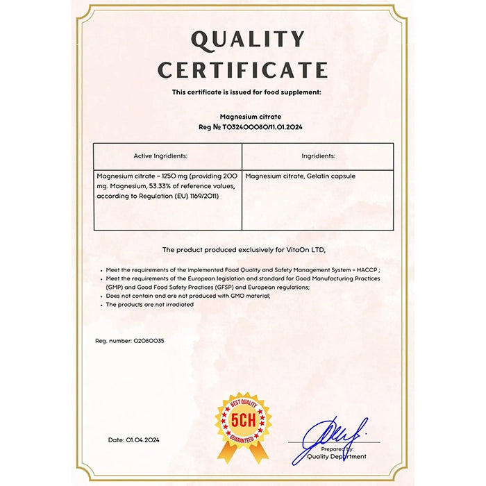 Dôvera našich klientov je našou hlavnou prioritou. Preto je horčíkový citrát od VitaOn vytvorený bez kompromisov v kvalite. Výroba prebieha podľa štandardu Dobrej výrobnej praxe (GMP) – zlatý štandard v odvetví, ktorý zaručuje prísnu kontrolu každého kroku pre maximálnu čistotu, bezpečnosť a účinnosť. Pre úplnú transparentnosť a garanciu autenticity má každý produkt registračné číslo T032400080, vydané agentúrou pre bezpečnosť potravín.