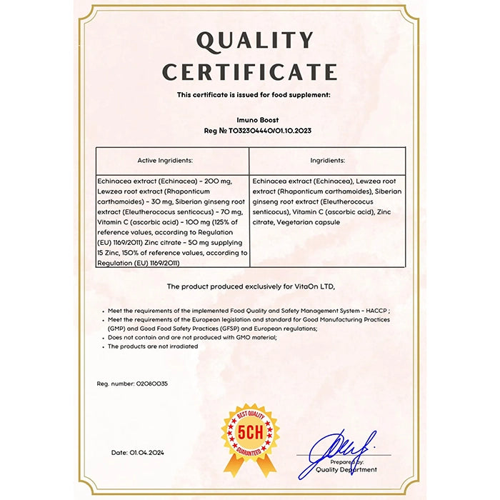 Dôvera našich klientov je našou hlavnou prioritou. Preto je každý náš produkt vyrábaný v súlade s normou Dobrá výrob‑ná prax (GMP), ktorá predstavuje zlatý štandard v priemysle. To zaručuje dôslednú kontrolu v každom kroku – od suroviny po konečný produkt, čím zabezpečuje maximálnu čistotu, kvalitu a bezpečnosť. Okrem toho „Immuno Boost“ disponuje registračným číslom Т032304440 vydaným Bulharskou agentúrou pre bezpečnosť potravín (БАБХ), čo overuje jeho autenticitu a súlad s regulačnými požiadavkami.