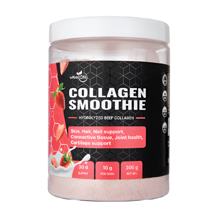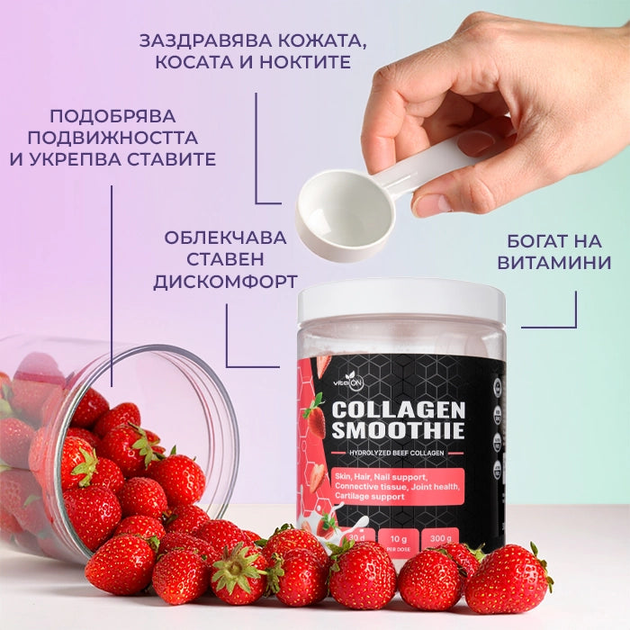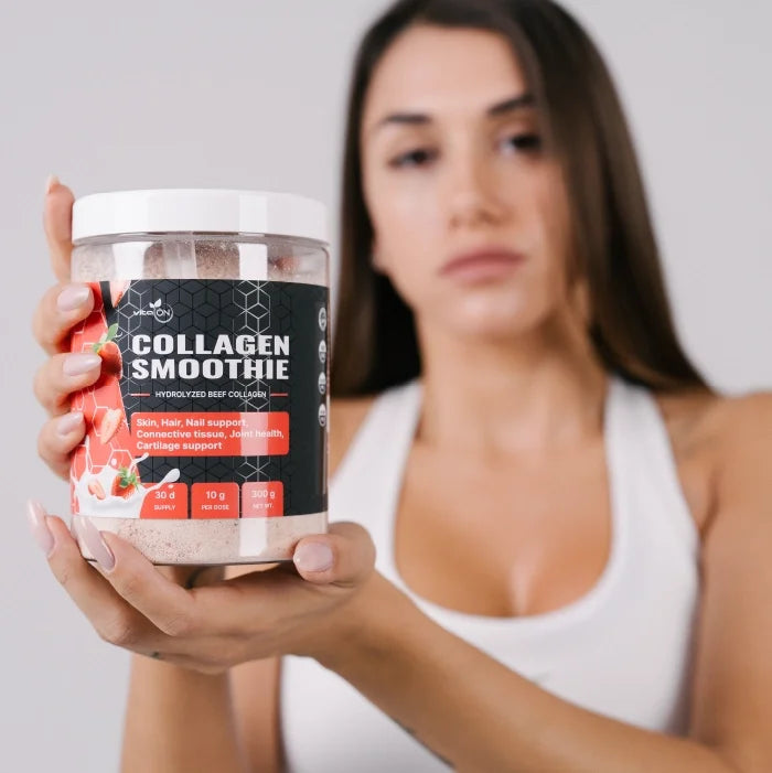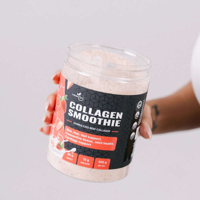 Po 25. roku života sa prirodzená tvorba kolagénu v tele znižuje, čo vedie k vzniku jemných liniek, strate pružnosti a diskomfortu v kĺboch. Naše kolagénové smoothie je chutná a inovatívna formula vytvorená na boj proti týmto príznakom. Kombinuje vysoko kvalitný, ľahko vstrebateľný hydrolyzovaný hovädzí kolagén s vitamínom C, ktorý je nenahraditeľný pre jeho syntézu, a mocnými antioxidantmi z lyofilizovanej divej čučoriedky a jahody. Je to vaša každodenná dávka krásy a zdravia, ktorá funguje zvnútra navonok.