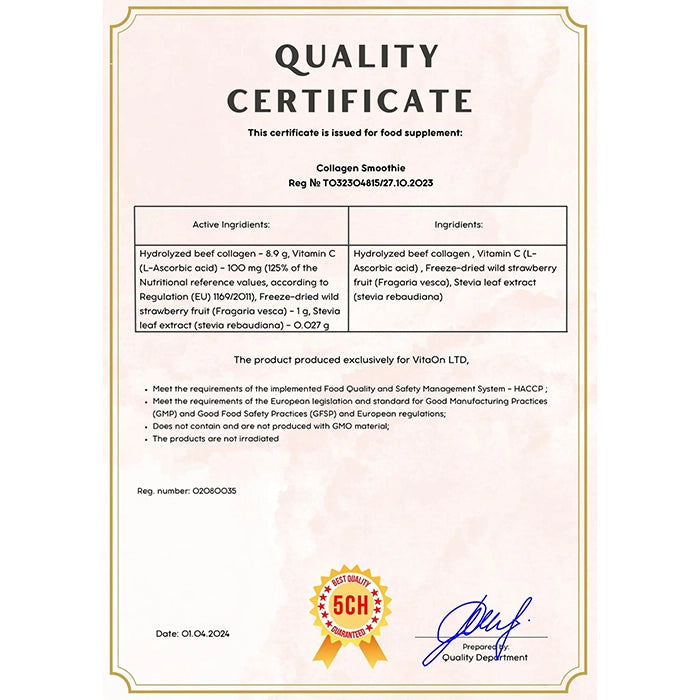 Dôvera našich klientov je našou hlavnou prioritou. Preto sa naše kolagénové smoothie vyrába v súlade so štandardom Dobrej výrobnej praxe (GMP) – zlatým štandardom v odvetví. To zaručuje prísnu kontrolu v každom kroku – od výberu surovín po finálny produkt. Ako ďalšia záruka autenticity a bezpečnosti je produkt registrovaný v agentúre pre bezpečnosť potravín s registračným číslom T032304815.