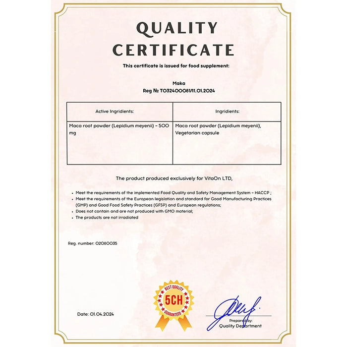 - Vysokokvalitný, koncentrovaný suchý extrakt z Maca koreň (Lepidium meyenii)