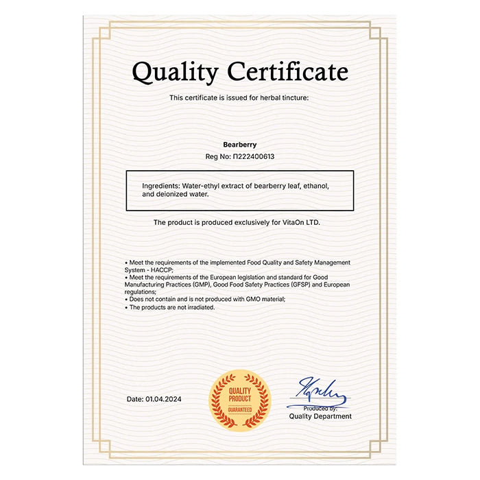 Produkty značky VitaOn sú vyrábané v súlade s prísnymi štandardmi Dobrej výrobnej praxe (GMP) – zlatým štandardom v oblasti výroby výživových doplnkov. Naša tinktúra „Medvedica lekárska“ je vyrobená z listov zozbieraných v ekologicky čistých horských oblastiach s cieľom zabezpečiť vysokú koncentráciu aktívnych zložiek. Dôvera zákazníkov je našou prioritou, preto každý produkt disponuje registračným číslom P222400613, vydaným B agentúrou pre bezpečnosť potravín, ktoré overuje jeho kvalitu a autenticitu.