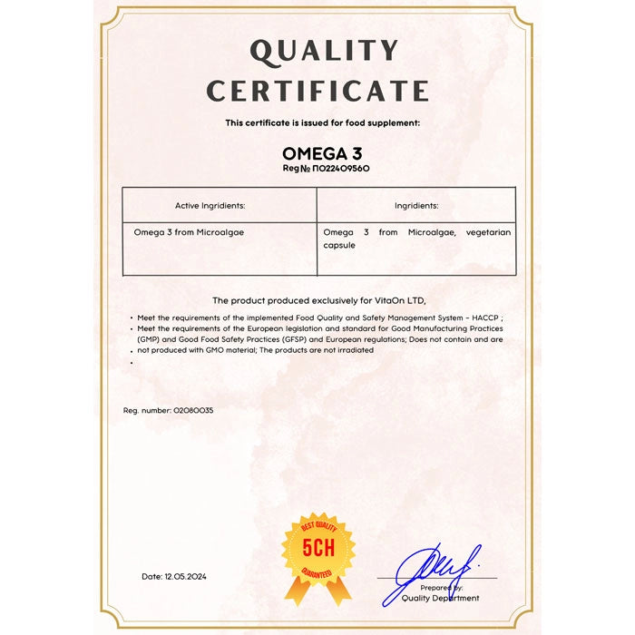 Dôvera našich klientov je našou hlavnou prioritou. Preto náš vegánsky Omega 3 sa vyrába v súlade so štandardom Dobrej výrobnej praxe (GMP) – zlatý štandard v odvetví. To zaručuje prísnu kontrolu v každom kroku – od kultivácie rias až po finálny produkt. Ako ďalšiu garanciu autentičnosti a bezpečnosti má produkt registračné číslo P222400453 vydané agentúrou pre bezpečnosť potravín.