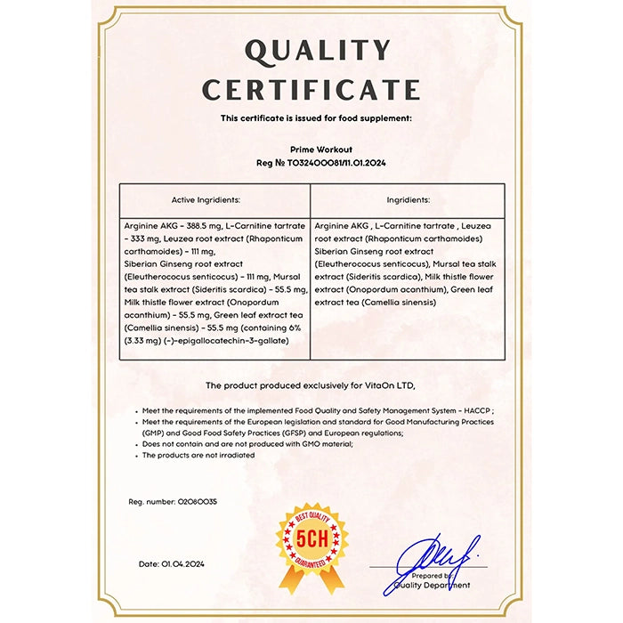 Dôvera našich klientov je našou hlavnou prioritou. Preto sa „Prime Workout“ vyrába v súlade s normou Dobrá výrob‑ná prax (GMP) – zlatým štandardom v priemysle. To zaručuje dôslednú kontrolu v každom kroku – od výberu surovín po konečný produkt. Ako ďalšiu záruku autenticity a bezpečnosti je produkt registrovaný v agentúre pre bezpečnosť potravín (БАБХ) s registračným číslom Τ032400081.