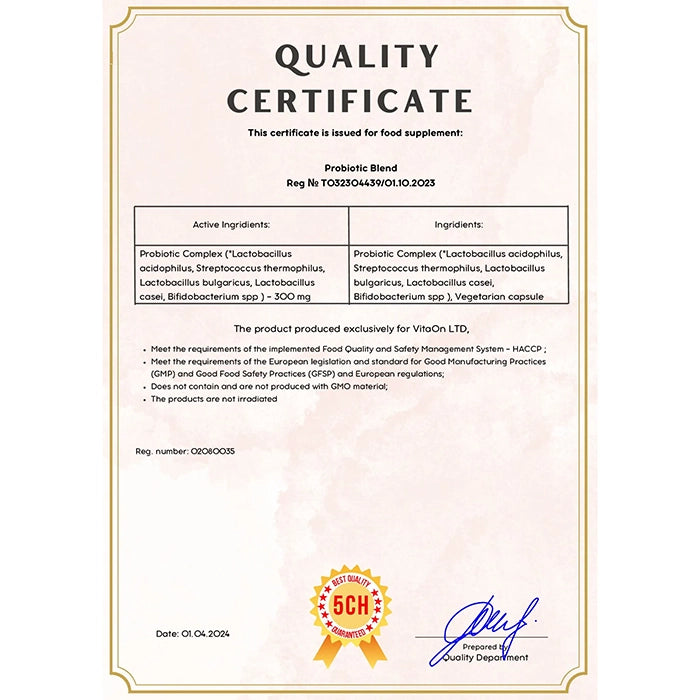 Dôvera našich zákazníkov je základnou prioritou. Preto je Probiotik Blend vyrábaný v súlade s normou pre Dobré výrobné praktiky (GMP) – zlatým štandardom v priemysle. To garantuje, že každý krok, od suroviny po konečný produkt, podlieha prísnej kontrole čistoty, bezpečnosti a účinnosti. Každý produkt má registračné číslo T032304439, vydané ktoré overuje jeho autenticitu a kvalitu.