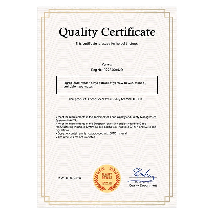 Tinktúra „Rebríček obyčajný“ predstavuje vysokokvalitný extrakt z kvetov jednej z najstarších a najctenejších liečivých rastlín – bieleho rebríčka (Achillea millefolium). Legenda hovorí, že jeho meno pochádza od mytologického hrdinu Achilla, ktorý ho používal na ošetrenie rán svojich vojakov. Naša tinktúra koncentruje silu tejto byliny, bohatej na polyfenolické zlúčeniny, ktoré majú priaznivý účinok na tráviacu sústavu, ženské zdravie a prirodzené regeneračné procesy v tele.