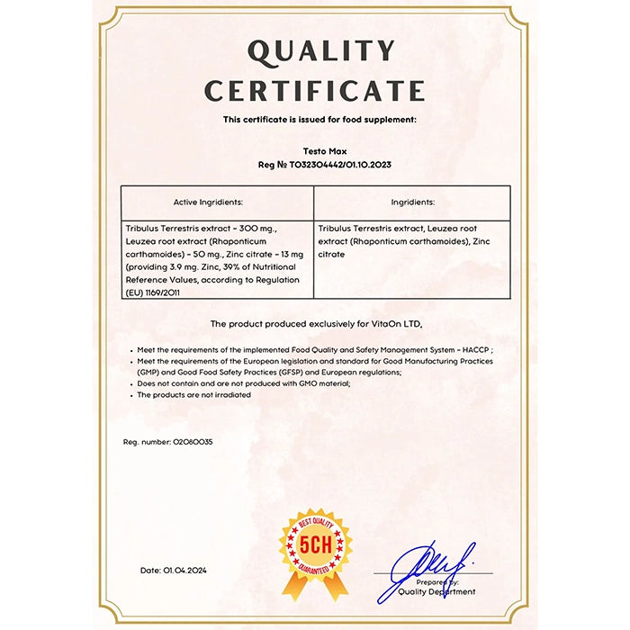 Dôvera našich klientov je našou hlavnou prioritou. Preto sa „Testo Max“ vyrába podľa štandardu Dobrá výrobná prax (GMP) – zlatého štandardu v odvetví. To zaručuje prísnu kontrolu v každej fáze – od výberu surovín až po finálny produkt. Ako ďalšia záruka pravosti a bezpečnosti je produkt registrovaný v agentúre pre bezpečnosť potravín (БАБХ) s registračným číslom Т032304442.