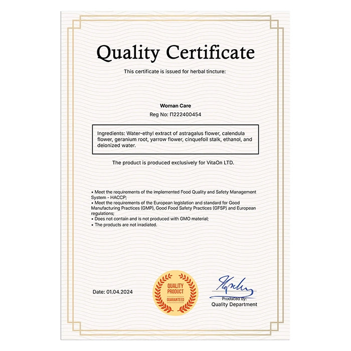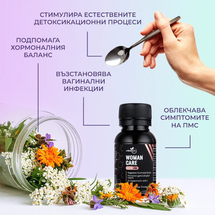 Tinktúra "Woman care" je cielená bylinná formula, vytvorená na to, aby zodpovedala špecifickým potrebám ženského organizmu. Namiesto toho, aby sa zameriavala len na jeden symptóm, poskytuje komplexnú podporu pri výzvach ako predmenštruačný syndróm (PMS), nepravidelný cyklus a nepohodlie počas menopauzy. Vyrobený z špeciálne vybraných bylín vysokokvalitný extrakt kombinuje synergický účinok piatich osvedčených rastlín v ľudovom liečiteľstve, ktoré majú vysoký antioxidantný a protizápalový potenciál. Formula bola vyvinutá na podporu prirodzených procesov v tele, pričom prispieva k úľave od nepohodlia a obnoveniu vnútornej rovnováhy.