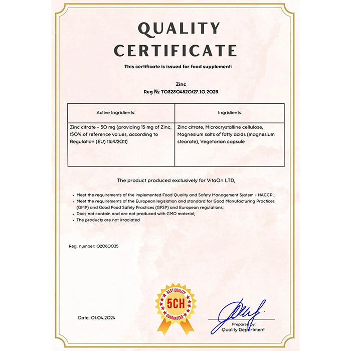 Dôvera našich zákazníkov je našou základnou prioritou. Preto náš Zinok sa vyrába v súlade s normou pre Dobré výrobné praktiky (GMP) – zlatý štandard v priemysle. To zaručuje prísnu kontrolu v každom kroku – od výberu surovín až po konečný produkt. Ako doplnková záruka autenticity a bezpečnosti je produkt registrovaný v agentúre pre bezpečnosť potravín s registračným číslom T032304820.